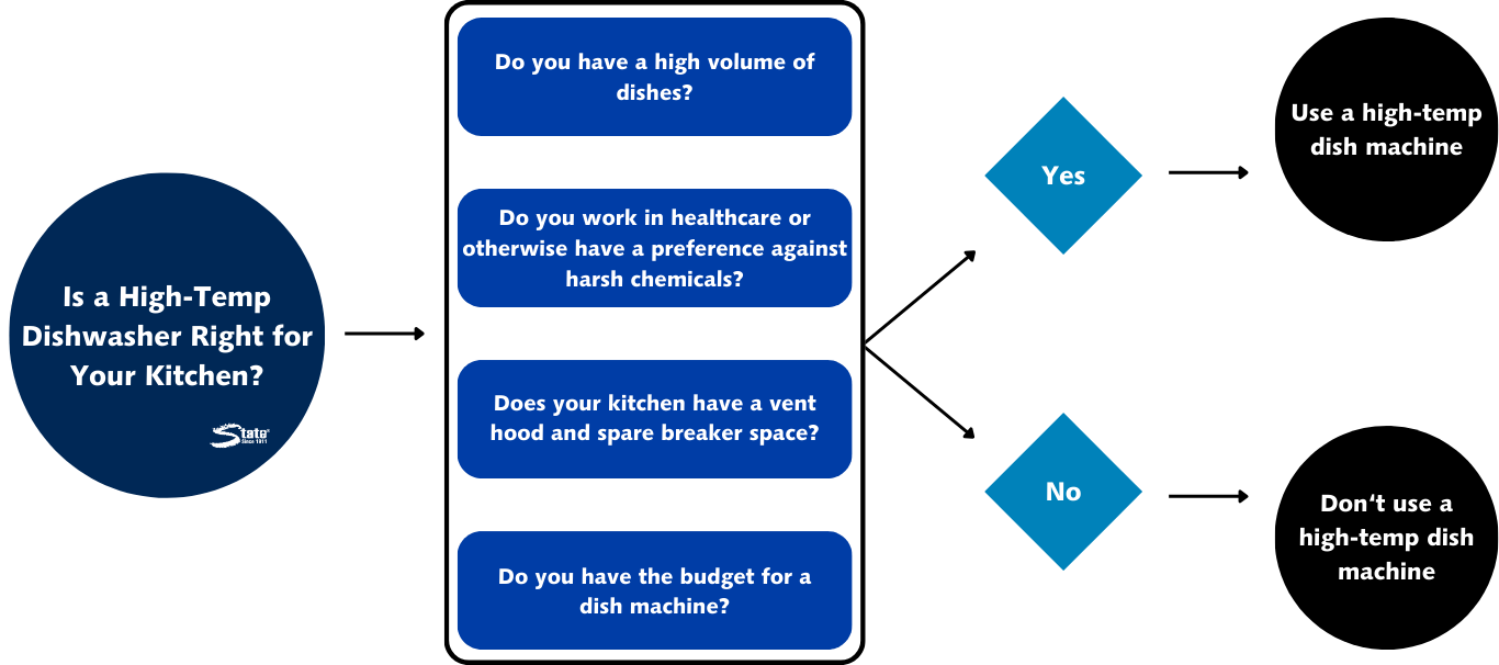 First, if you handle a smaller quantity of dishes, it might not make sense to use a high-temp dishwasher. Yes, the efficiency is nice, but it may not be necessary when you don’t go through that many dishes with a heavy grease and soil load at once.
