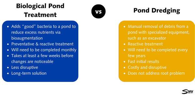 As opposed to dredging, biological pond treatment involves adding “good” bacteria to your pond to reduce excess nutrients via bioaugmentation.